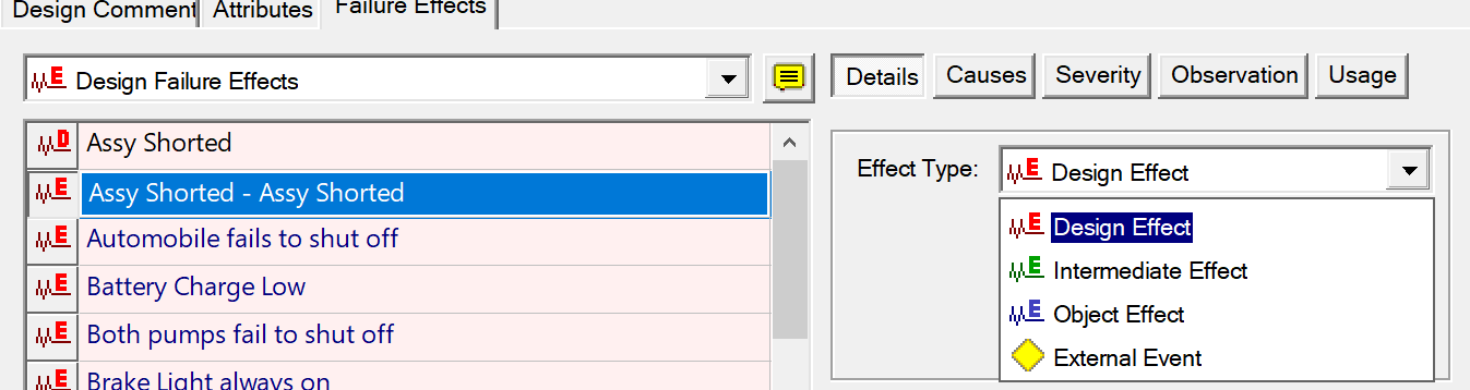 You can change the type of an existing failure effect using a dropbox on the Details tab of the Failure Effects panel.