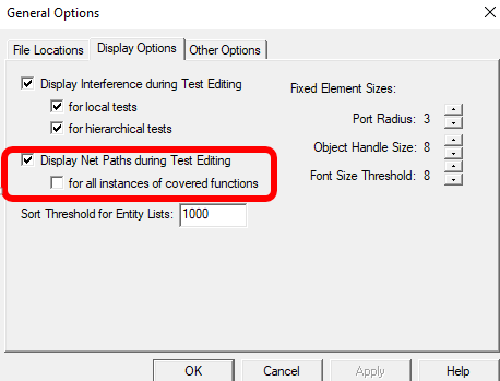 The "Display Options" - “Display Net Paths during Test Editing” checkbox is used to specify whether or not net paths are to be color-coded during test editing. If this is enabled, the “for all instances of covered functions” checkbox can be used to specify whether or not color-coding should be applied to paths (nets) proceeding from all instances of each covered function (by default, only primary instances will be colored).