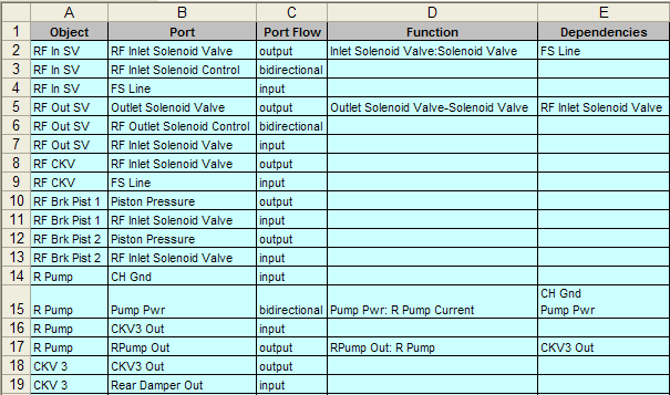 In the eXpresseXpress Model topology export format, the Object column contains the abbreviation of a component or assembly. Because object abbreviations may contain carriage returns, only a single object can be listed in each cell in this column. This same object abbreviation will typically occur in multiple cells in this column, as multiple rows are usually needed to define all ports and output functions associated with that object (refer to the excerpt from a sample spreadsheet depicted below). All occurrences of the same object abbreviation in this column are assumed to refer to the same component in the design. In fact, when more than one object are assigned the same abbreviation, eXpress will automatically modify one of the names during export (see Handling of Duplicate Names).