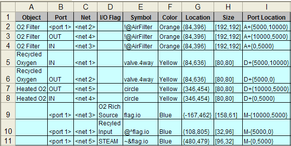 In the example below, the Symbol column appears as column E. According to the prefixes in this column, the AirFilter is both flipped and rotated (cells E2::E4). The I/O flag named "Recycled Input" (row 10) is marked as being local to the current design level (and it is rotated), whereas the I/O flag named "STEAM" (row 11) provides multiple-output information to the next level up (as well as being flipped horizontally).