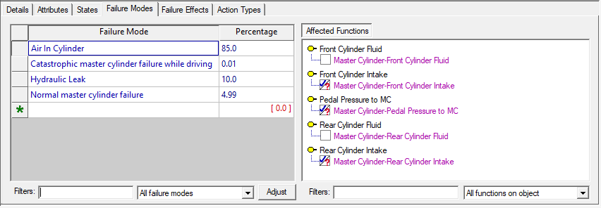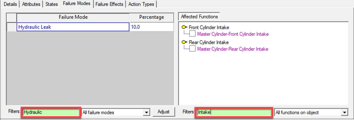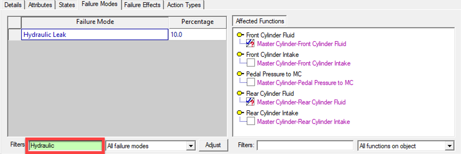 You will find this option particularly useful when reviewing failure modes for objects with a large number of functions. Also useful is the third setting for this dropbox, which displays only those functions which are not affected by the selected failure mode: Here the Filter has been set to Hydraulic. With models that have many failuire modes this is very essential to reduce the amount of Failure modes shown.