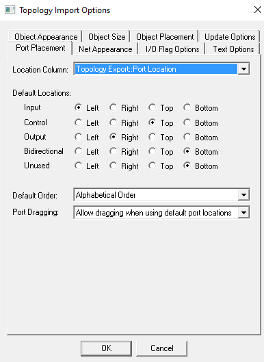 The Default Order dropbox specifies whether ports that are placed by default on the same side of an object are to be alphabetized or alphabetically sorted based on the order in which they appear in the spreadsheet.